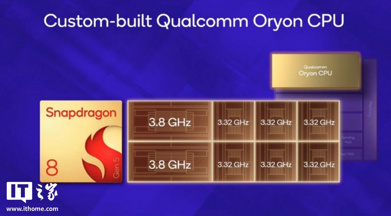 结合IT之家今天报道,高通骁龙 8 Gen 5 处理器现已正式发布,配备第三代 Oryon CPU,包括 2 个主频为 3.8 GHz 的 prime 核心和 6 个 3.32GHz 的性能核心,相比两年前的骁龙 8 Gen 3 在 CPU 任务上有 36% 提升,GPU 提升 11%,AI 任务提升 46%。