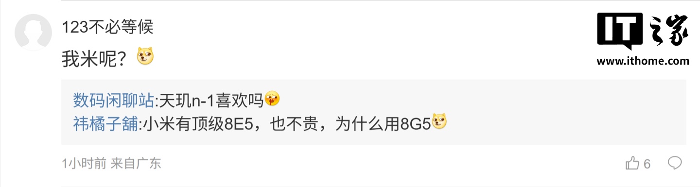 后续有用户在评论区表示:“其实比 8sgen4 要好的多,至少能效核缓存没有砍”,博主回复道:“是的,还是和最开始说的一样,高负载游戏比 8e 差一点,但差距没有那么大”;另一名用户则询问道:“我米呢?”,博主则回复道:“天玑 n-1 喜欢吗”。
