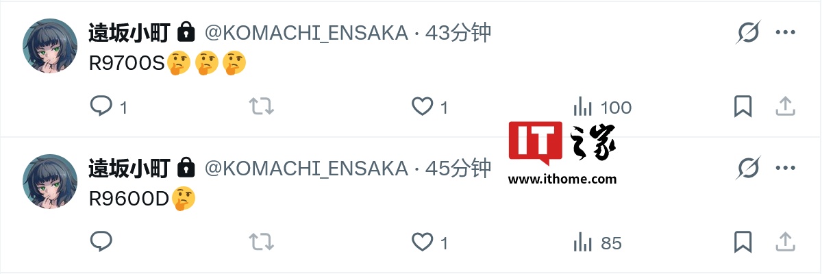 IT之家 11 月 28 日消息,消息人士 遠坂小町 @KOMACHI_ENSAKA 稍早前在 X 平台动态中提到了 "R9700S" "R9600D" 这两个代号。