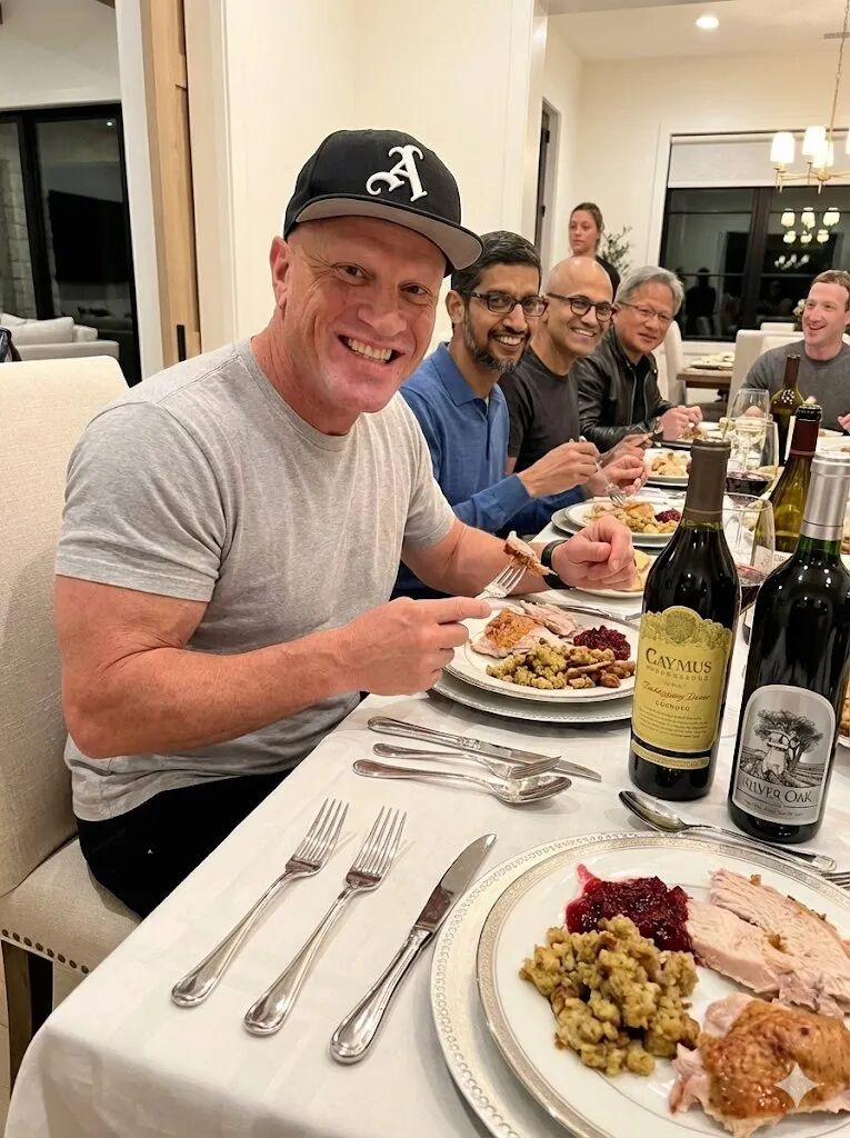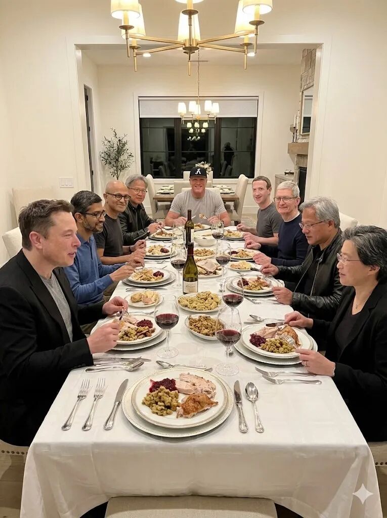 照片细节满满:火鸡、红酒、烛光一字排开,旁边是笑得乖巧的扎克伯格、马斯克、纳德拉、库克……画面精致到像杂志大片。