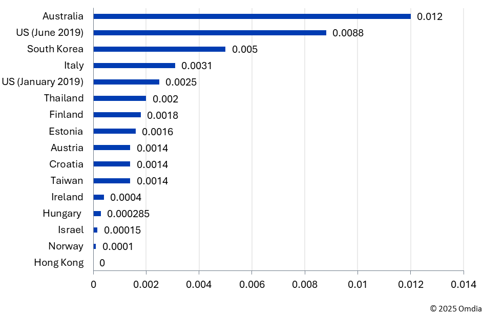图1:按国家/地区划分的24GHz以上频段频谱授予价值(美元/MHz/人口)。