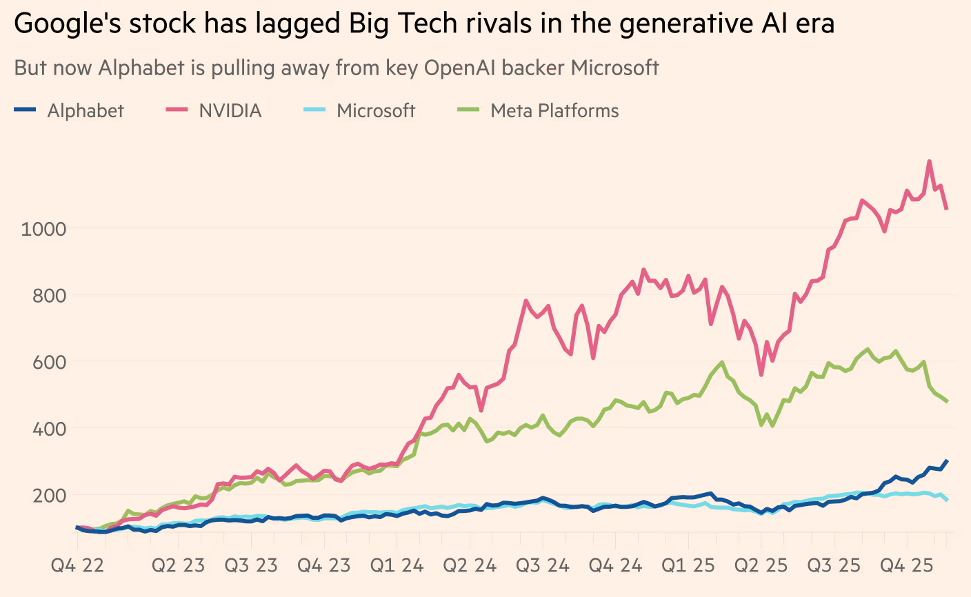 就在一年前,许多人还曾认为,谷歌为缩小OpenAI巨大领先优势而付出的努力注定失败。在2023年至2024年由AI推动的股市上涨行情中,由于市场担忧谷歌的摇钱树搜索引擎会被ChatGPT及Perplexity等新型AI搜索应用侵蚀,其母公司Alphabet的股价一直远远落后于其他科技巨头。