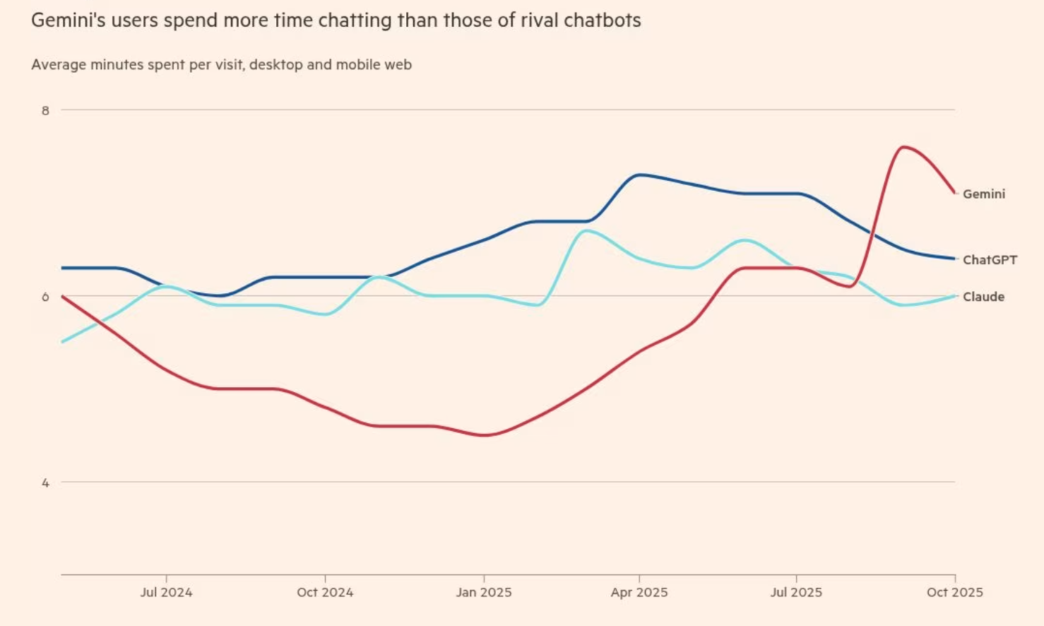 根据网站分析公司Similarweb的数据,OpenAI每周拥有超过8亿用户,在整体聊天机器人使用方面仍占据绝对主导地位,但如今用户花在Gemini上的聊天时间已经超过了ChatGPT。