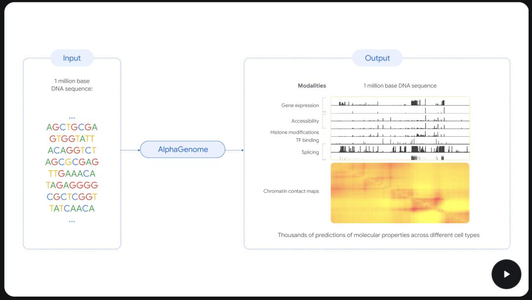 同年,谷歌也发布了 AlphaFold3 和 AlphaProteo,前者能精准预测蛋白质与 DNA、RNA 等其他生命分子的相互作用,后者则能主动设计出能与疾病靶点结合的定制蛋白质。2025 年,谷歌又推出了 AlphaGenome,进一步把预测能力延伸到了 DNA 层面,从 DNA 序列预测基因突变对生物学过程的影响。