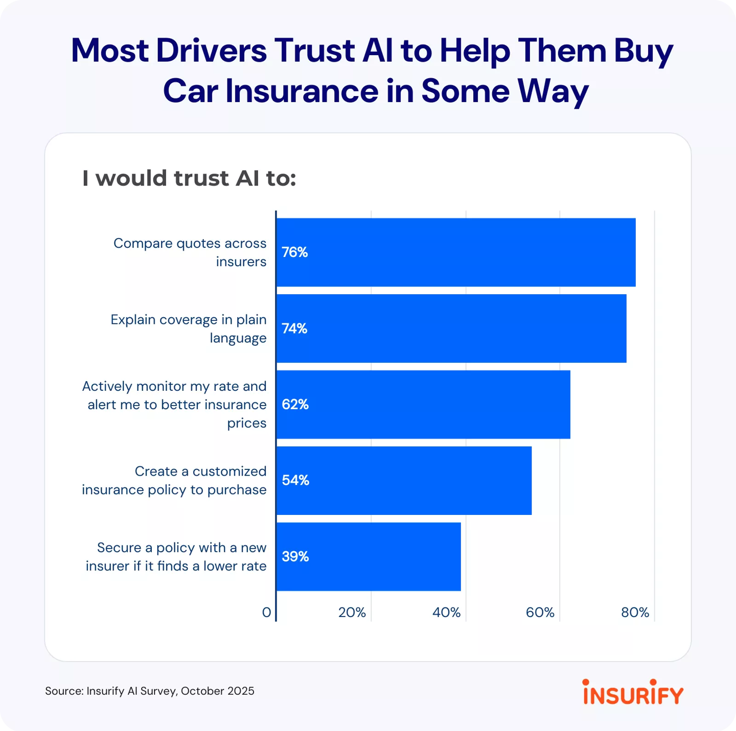 AI 的作用不仅限于比价,还能协助完成保单的最终确认。Insurify 的数据显示,39% 的驾驶员愿意让 AI 代为敲定保险方案,前提是能获得更低的保费;当潜在节省金额达到 1,000 美元时,这一比例跃升至 68%,表明一旦经济利益足够显著,人们对 AI 的信任会迅速提升。