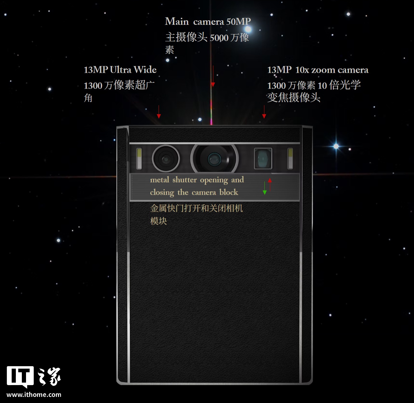 此外,这款手机的重量为 268 克,尺寸为 5.87*4.45*0.33 英寸,机身顶部拥有红外发射器,可控制家电,配备 5000 万像素主摄、1300 万像素超广角、1300 万像素 10 倍光变长焦。