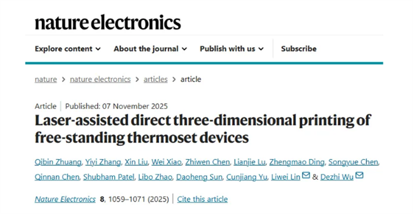 12月1日,厦门大学萨本栋微米纳米科学技术研究院吴德志教授团队在3D打印技术领域实现重要突破——创新提出“激光原位诱导直写打印”技术,将热固性材料三维柔性器件的固化时间从传统工艺所需的数十小时大幅缩短至0.25秒,有效解决了该领域长期存在的成型速度慢、工艺复杂、性能难以精确调控等核心难题。