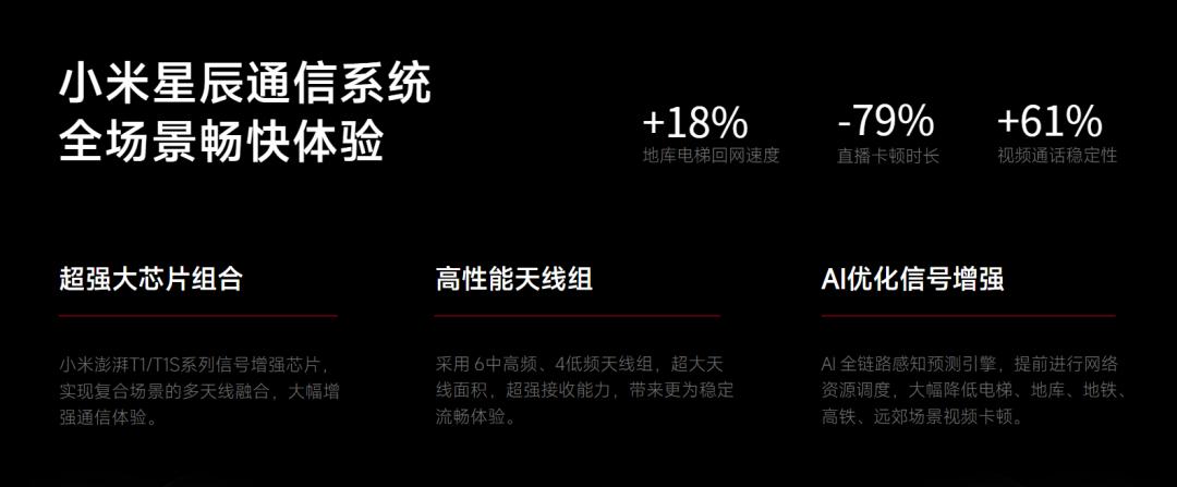 超强大芯片组合:小米澎湃 T1/T1S 系列信号增强芯片,实现复合场景的多天线融合,大幅增强通信体验