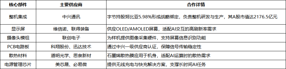 豆包AI手机的落地,依托于“上游技术支撑—中游硬件集成—下游应用落地”的完整供应链体系。字节跳动以大模型能力为核心,通过与中兴等硬件厂商合作,将技术势能转化为产品动能,各环节供应商共同构筑起生态壁垒。