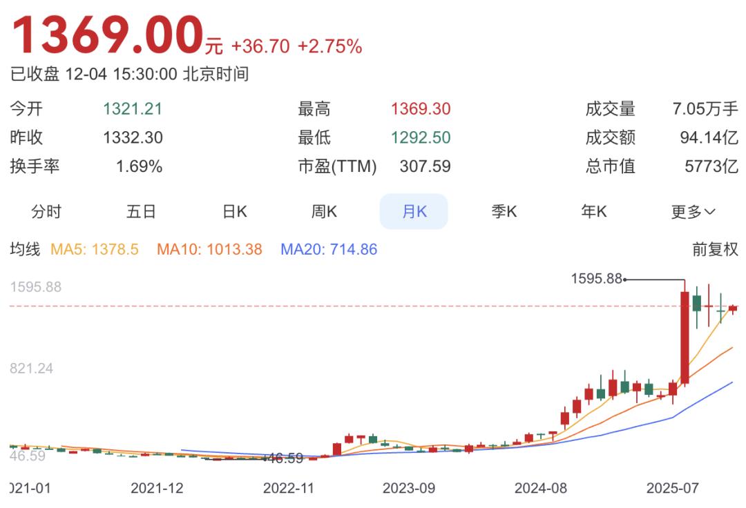 业绩的强劲表现带动了股价的持续上扬。自2021年以来,寒武纪市值已增长9倍,截至12月4日收盘,总市值来到5773亿元。