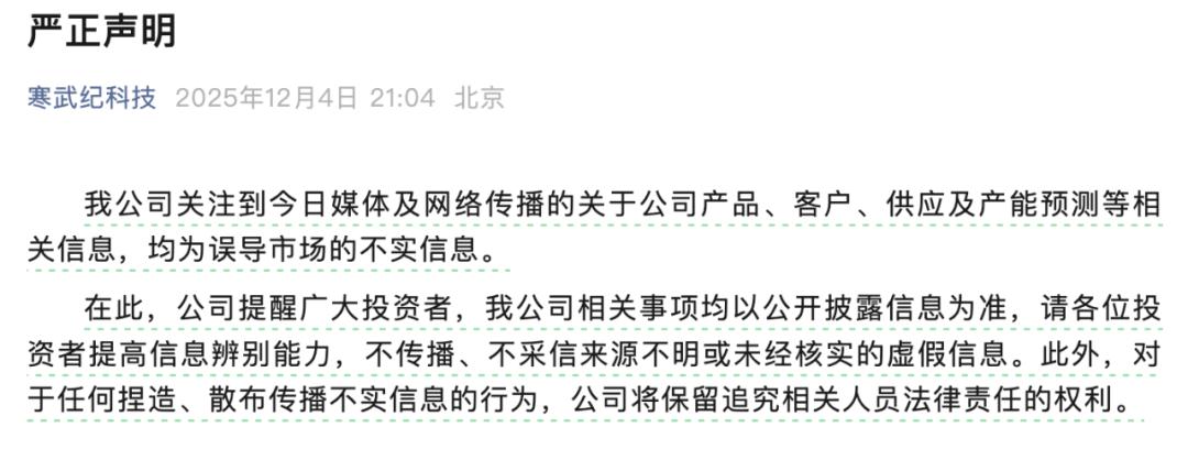 不过很快,北京时间12月4日晚,寒武纪即发布“严正声明”表示:今日媒体及网络传播的关于公司产品、客户、供应及产能预测等相关信息,均为误导市场的不实信息。