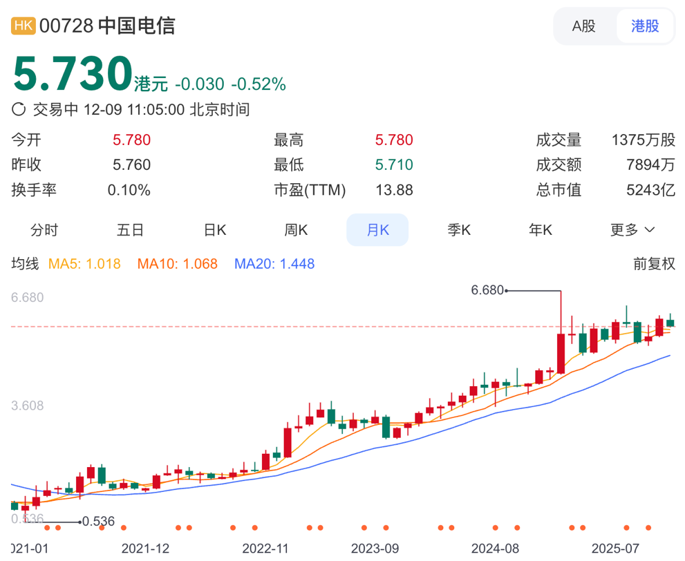 而中国电信H股从2021年开始保持上升趋势,中国电信也在2021年完成回A上市。此外,在今年9月,中国电信H股被正式纳入恒生指数成分股,充分体现了资本市场对中国电信转型升级的高度认可,也体现了投资者对中国电信在“人工智能+”时代的发展信心。