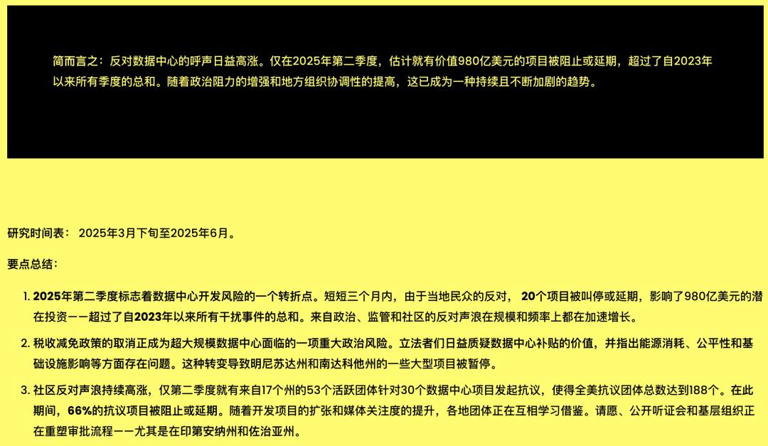 仅在2025年第二季度,就有20个大型数据中心项目因当地社区的反对而被叫停或推迟,涉及投资额高达980亿美元。