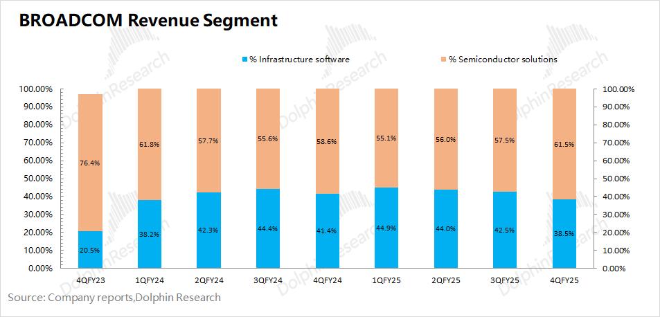 由于博通擅长外延并购,公司通常把调整后EBITDA%作为公司的经营面指标之一。而海豚君测算公司2025财年第四季度的调整后EBITDA%回升至67.8%,好于公司此前指引(67%)。