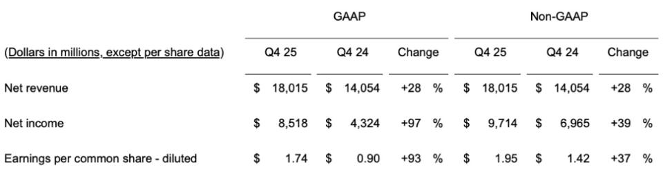 净利润85.18亿美元,同比上涨97%;每股摊薄收益为1.74美元,同比增长93%。按照美国通用会计准则,博通第四财季净利润为97.14亿美元,合每股收益1.95美元,超出华尔街分析师平均预计的1.86美元。