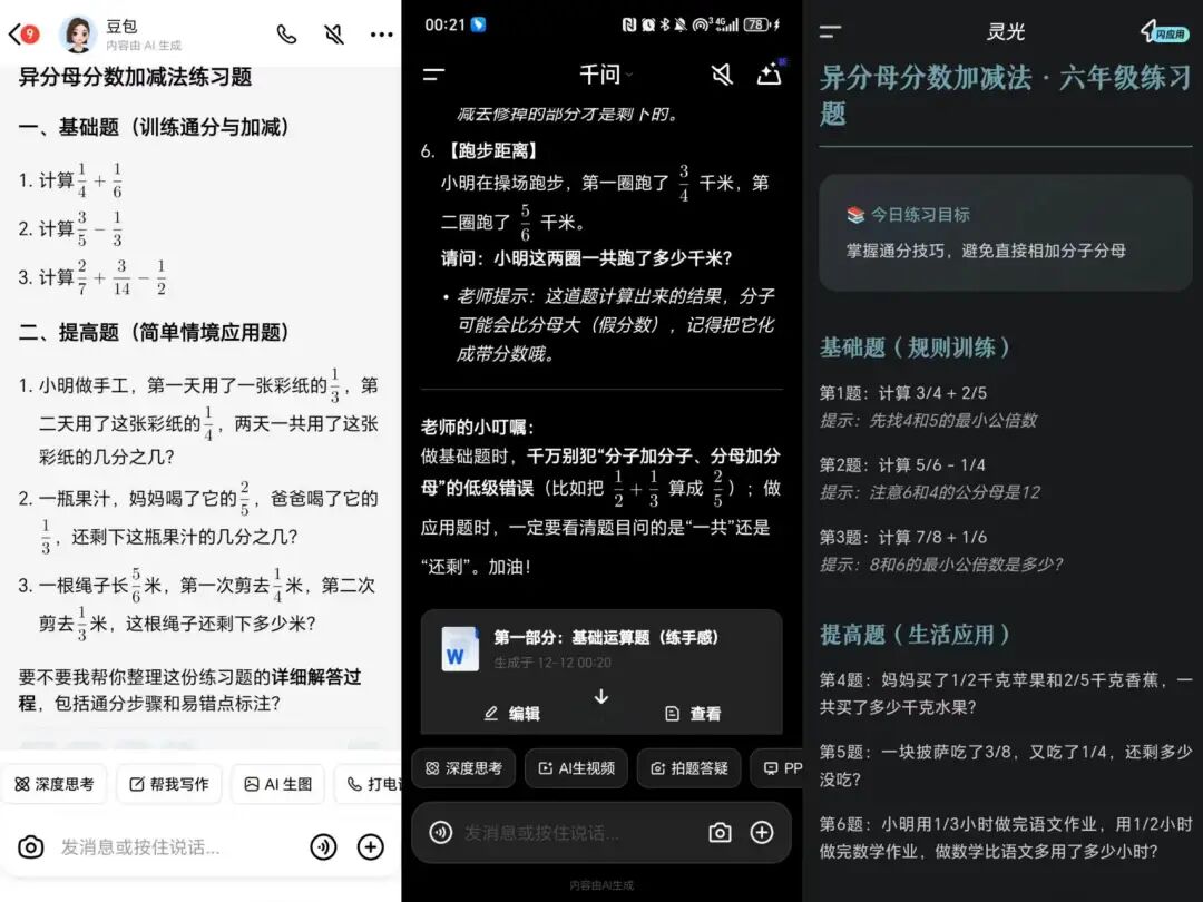 到了第二步,出练习题的针对性和承接感开始成为分水岭。豆包给出的三道题,难度控制得不错,也大致围绕分数加减展开,但和前一轮诊断提到的薄弱点关联不算非常紧密。灵光会刻意提示「这几道题重点练习通分和单位统一」,但在题目本身的设计上,有时会出现额外的提醒和警示,让练习显得略微「用力过猛」。千问在这一环则做得比较自然:三道题分别对应前面提到的几个弱点,每道题后面都有一句简短说明,例如「这道题主要考你是不是先把分母变成一样的」,既照顾到了逻辑承接,也便于家长理解为什么要做这道题。
