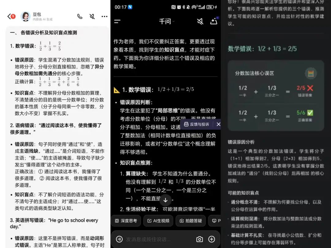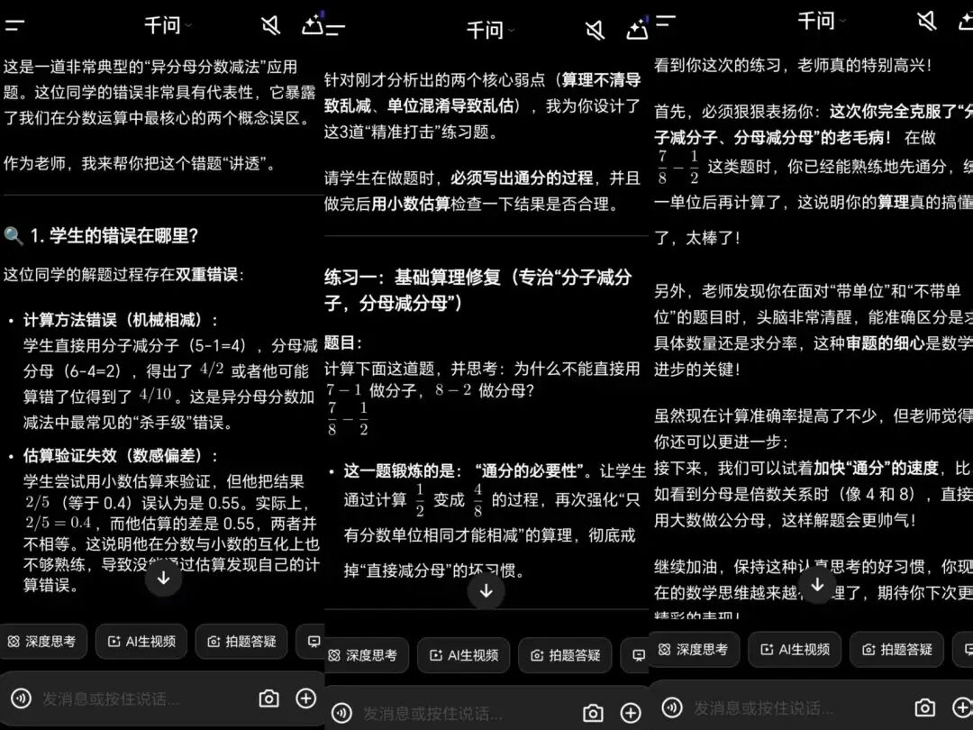 在分数加法的错误上,豆包准确指出了「直接把分子分母相加」这个表层问题,也能提到「没有通分」这一关键步骤,只是整体分析停留在规则层面,延展不多。千问的回答多了一层「学生视角」,比如会提到学生可能受到「小数估算」的影响,把 1/2 当成 0.5,1/3 当成 0.33,于是习惯性用「差不多」的心态去拼结果,诊断中带了点同理心,但没有把错因精确地落到某个知识点上。