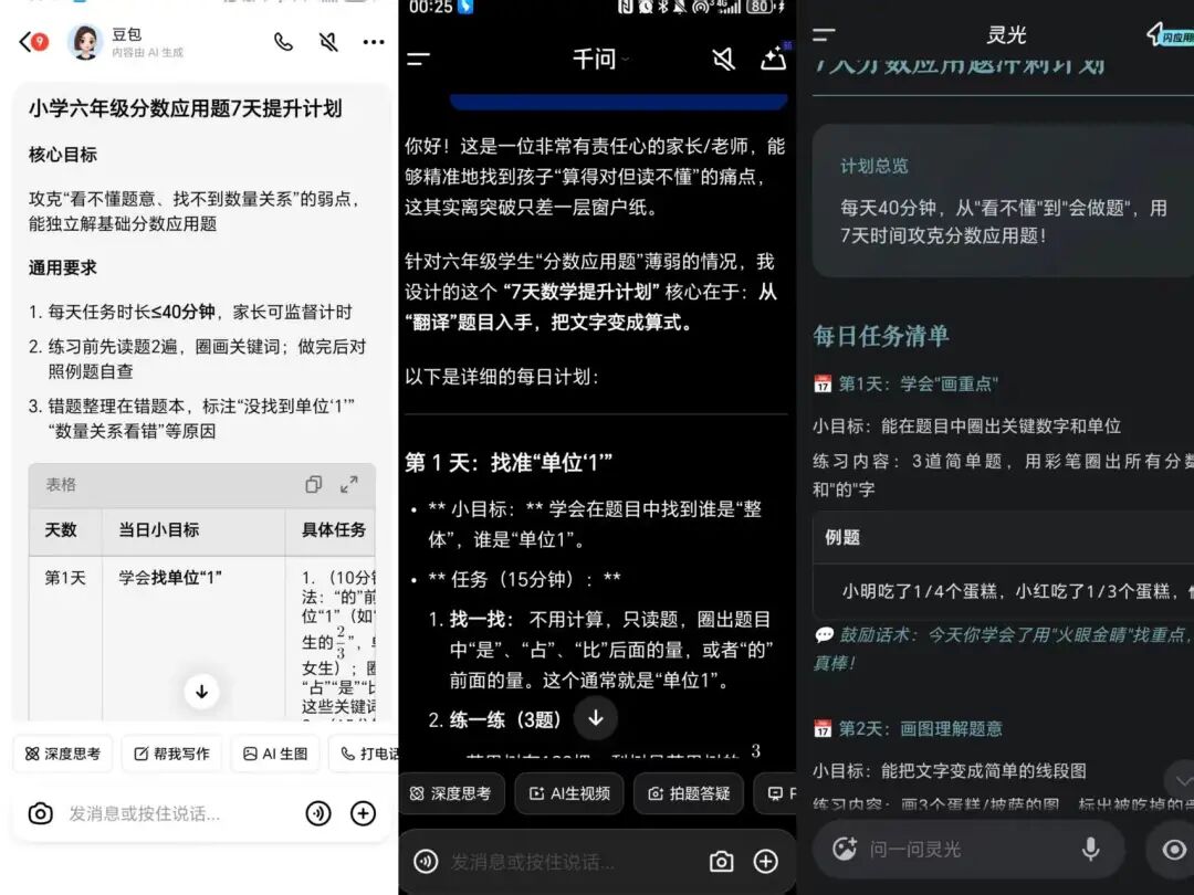 豆包像一套结构扎实、执行可靠的学习工具。它擅长把过程拆开、把步骤讲清楚,任务给得越具体,它完成得越干净利落。千问更像一位试图理解学生、也在意教学流程的老师:能讲清楚、能看明白错因、能给出一组有教学意图的练习,也能在一两周的学习路径上保持语言和逻辑的连贯。灵光则在诊断和呈现方面有自己的长板,尤其是在把错误放回知识网络、把解析做得更「课堂化」这一点上,展现出明显的专业感。