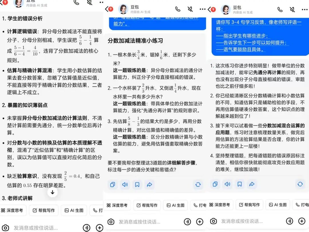 在第一步诊断中,三款助手延续了前面的水准:豆包能准确指出计算规则上的错误,千问会补充学生可能的直觉思维路径,灵光则把问题更系统地归类到通分、单位统一和数量关系理解等环节。