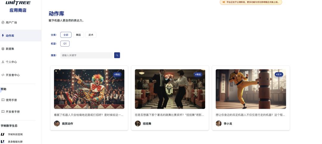 而这些APP都是人形机器人应用,基于宇树科技自家操作操作系统上线的。目前在官网有用户广场、动作库、个人中心、以及开发者中心。