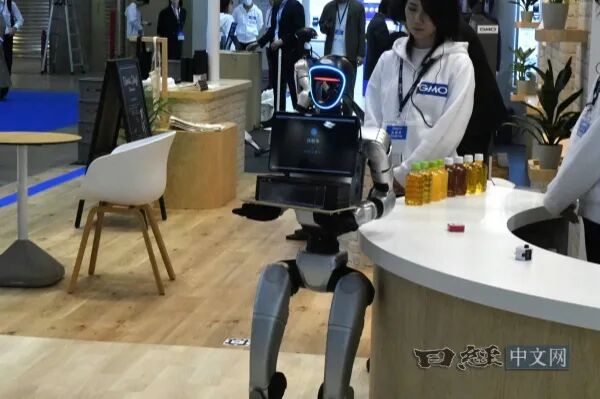 这6台机器人都是中国企业生产的。“G1”型号的机器人可以帮来到展区咖啡厅的顾客点餐并运送饮料和点心。G1由成立于2016年的中国独角兽企业宇树科技开发。身高130厘米,重量35公斤,身材小巧,但具备稳定的步行性能。
