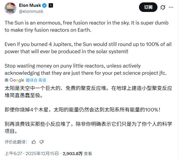 12月15日,马斯克在X上公开唱衰可控核聚变,他称“太阳就是天空中一个巨大的、免费的核聚变反应堆”,并直言“在地球上建造小型核聚变反应堆,简直愚蠢至极”。