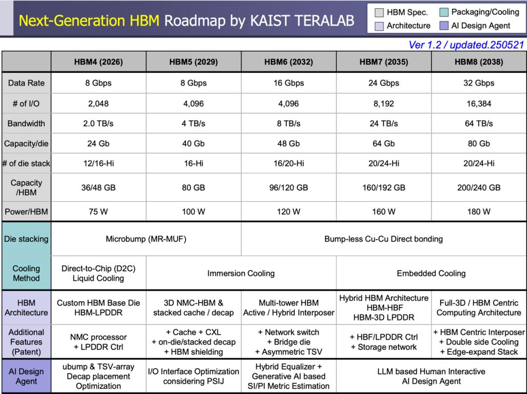 最近,韩国KAIST大学TERALAB实验室(韩国科学技术院tera字节互联与封装实验室)发布了一份371页的《HBM Roadmap Ver 1.7》,这份报告堪称HBM领域的“圣 经”——不仅详细拆解了当前HBM3/3E的技术细节,更画出了从2026年HBM4到2038年HBM8的完整发展蓝图。报告里的每一个参数、每一张架构图都在告诉我们:未来10年,AI能跑多快、算多准,很大程度上要看HBM能“送”多快。