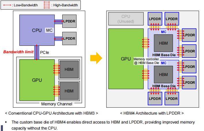 早年的HBM是“一刀切”的——不管你是做AI训练还是游戏显卡,Base Die的设计都一样。但HBM4的Base Die能“按需改造”,最实用的功能就是“直接连接LPDDR”: