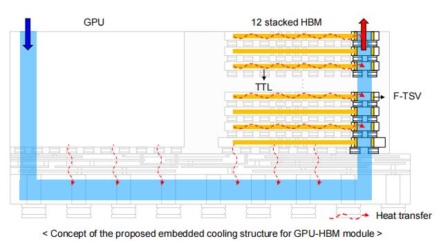 160W的功率,传统的浸没式冷却以应对集中化的高热量,无法满足稳定运行需求,HBM7采用“嵌入式冷却”——在Base Die和Core Die里直接刻出“微型水道”(直径50微米,比头发丝还细),让冷却液直接在芯片内部循环,热量能快速被带走(热传输线(TTL)和流体热沉(F-TSV)可以通过将冷却液从GPU循环到中介层和HBM,从而高效地冷却HBM模块。TTL可将HBM芯片内部的热量传递给流经F-TSV的流体)。