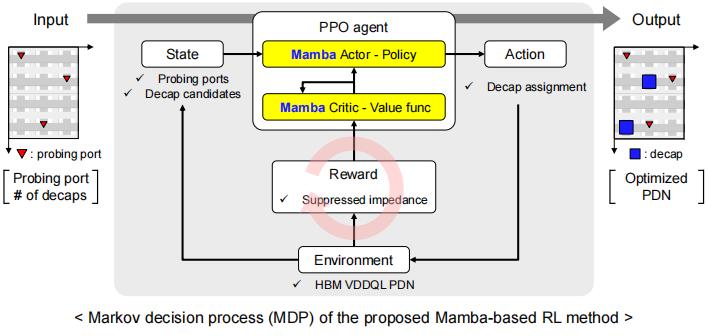 HBM里要放很多“去耦电容”来稳定电压,电容的位置和数量直接影响电源噪声。以前设计师要手动调整,试100次才能找到最优方案;现在用Mamba-RL(基于Mamba模型的强化学习算法),自动尝试不同的摆放方式,20分钟就能找到最优解,电源噪声降低29%,设计时间省了99.6%。