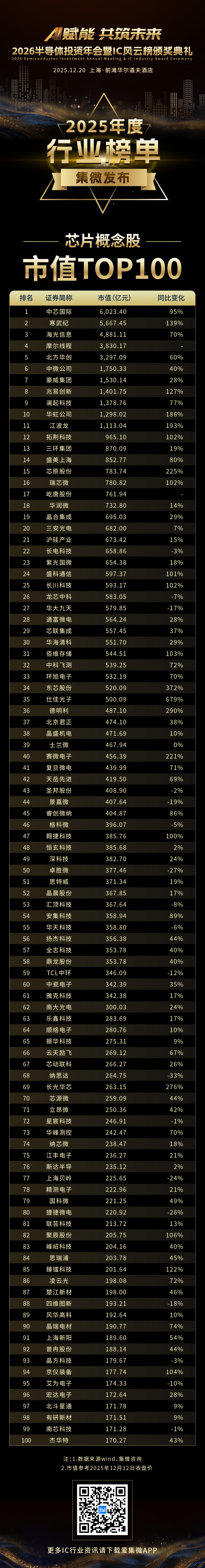 此为“芯片概念股”系列榜单之《中国芯·芯片概念股——市值TOP100》。
