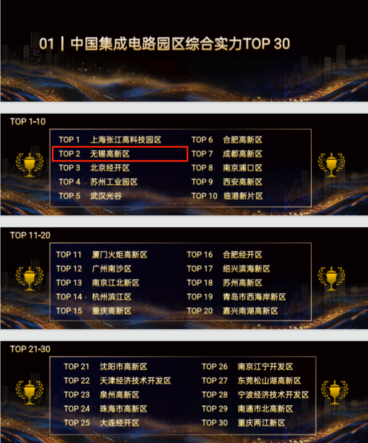 12月20日,由中国半导体投资联盟主办、爱集微承办的2026半导体投资年会暨IC风云榜颁奖典礼在上海举行。活动现场正式发布了《中国集成电路园区综合实力TOP30》无锡高新区位列全国第二,仅次于上海张江高科技园区。这是无锡高新区连续第四届蝉联此项殊荣。同时无锡高新区再度获评“年度最佳集成电路园区奖”。