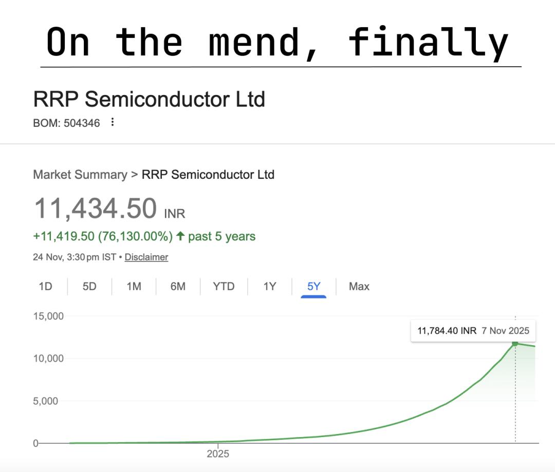 讽刺的是,在BSE目前允许「每周最多下跌1%」的规则下,RRP半导体的股价要跌回20卢比,至少需要12年以上。而它从20卢比附近,被推到如今的高度,只用了短短一年半。