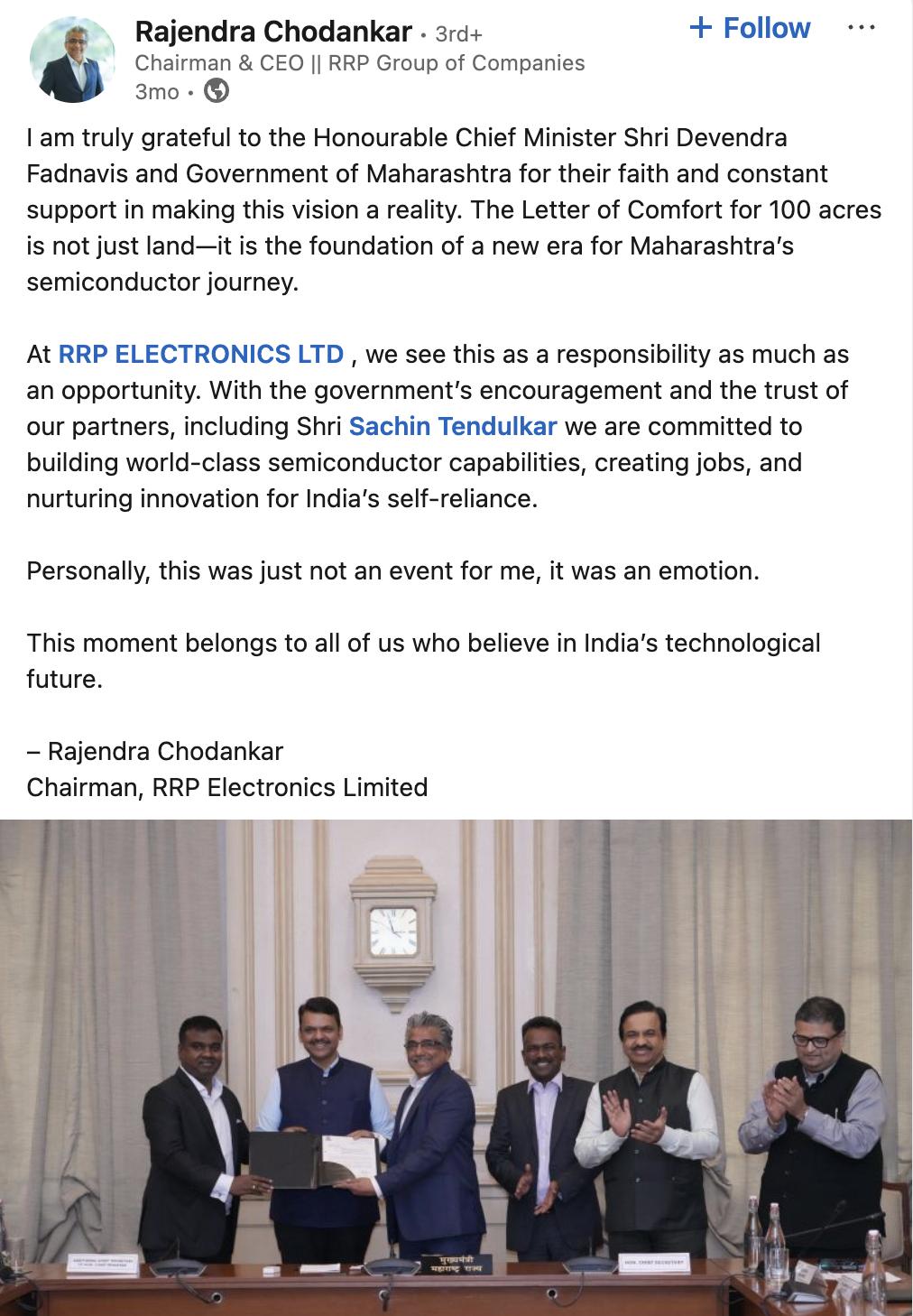 Rajendra Chodankar既是马哈拉施特拉邦政府和体育传奇明星Sachin Tendulkar投资的RRP电子公司的发起人,又恰好是RRP半导体的最大股东。