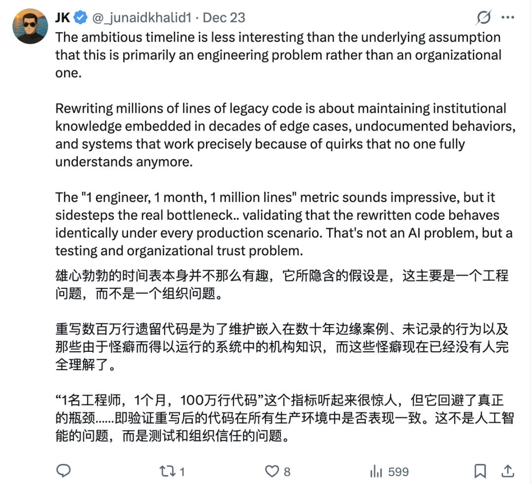 看来我的帖子引起了比我预期更多的关注,很多人对我的帖子进行了各种猜测和解读……在此澄清一下,Windows并没有被用Rust重写并加入AI。这个研究项目,我们正在开发让不同编程语言之间迁移成为可能的技术。我发帖的目的,是寻找志同道合的工程师,而不是为Windows11+制定新战略,也并非暗示Rust是终点站。