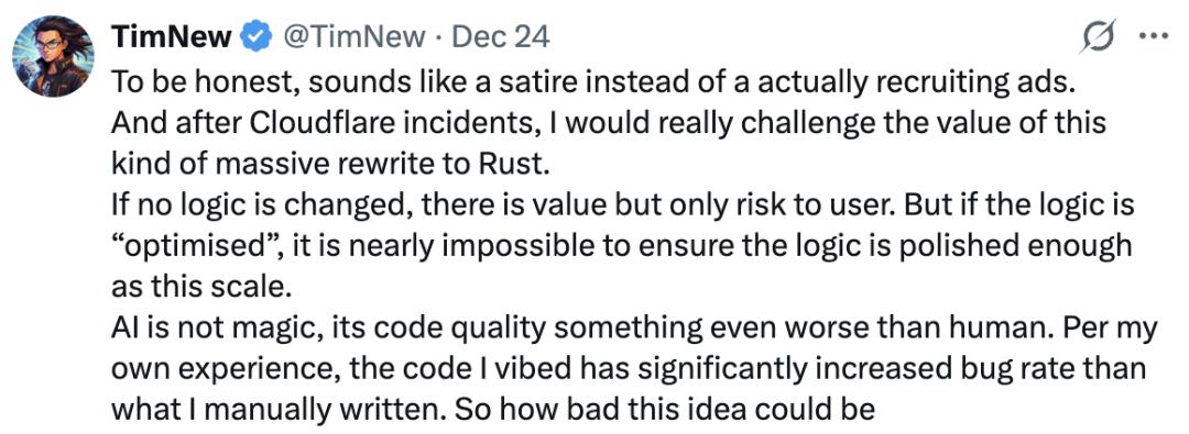 这与此前内部杰出工程师,声称要用AI+Rust淘汰C/C++的言论大相径庭: