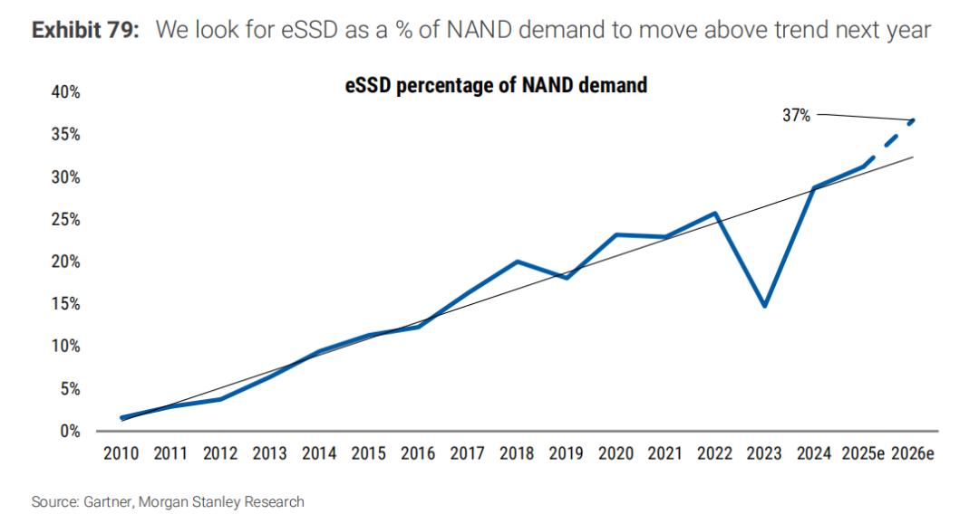 NAND方面,预计明年位增长可达20%-25%,为行业多年来的最高水平。目前大摩预计eSSD的年增长率将达到40%-50%。2026年。尽管电子固态硬盘(eSSD)市场规模的预测与估算存在差异,但鉴于超大规模采购订单的规模(主要采购商每家约40EB),且我们目前认识到这些需求主要为增量需求,我们认为市场每年新增120EB以上的eSSD容量似乎非常可行。