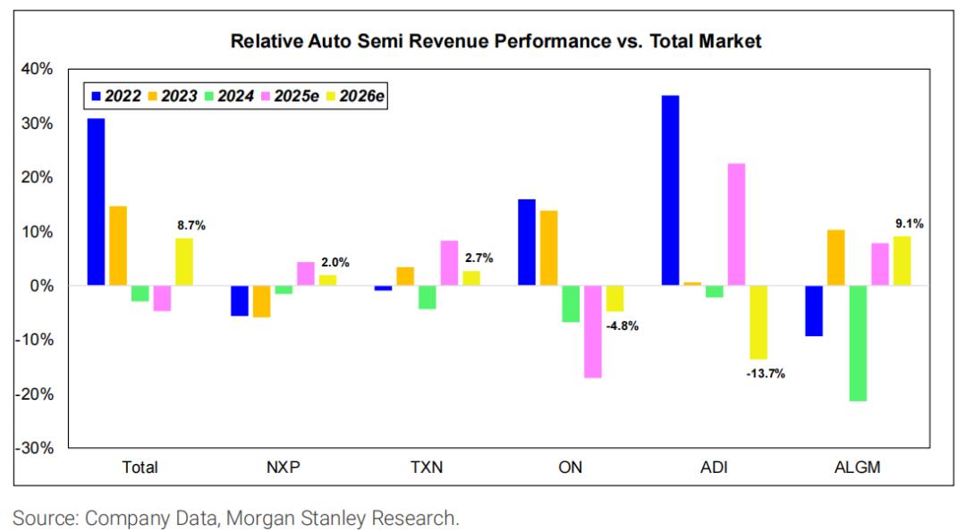 2025年汽车市场复苏滞后于其他终端市场,但大摩预计2026年将出现增长势头的转折。大摩认为,补货周期可能会在2026年上半年左右形成,即使终端需求没有同步回升,也会带来上行动力。其中,大摩点名恩智浦,评价其是预计明年营收将超越历史峰值的仅有的两家公司之一。原因是,恩智浦汽车业务占比平均保持在50%以上高位。