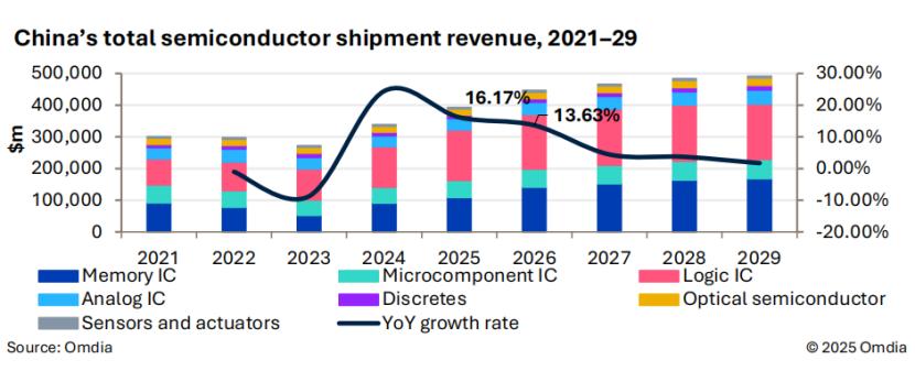 Omdia表示,2025年,中国半导体市场预计将实现显著增长,市场规模达3930亿美元(同比增长16%以上),主要得益于人工智能数据中心的投资推动。