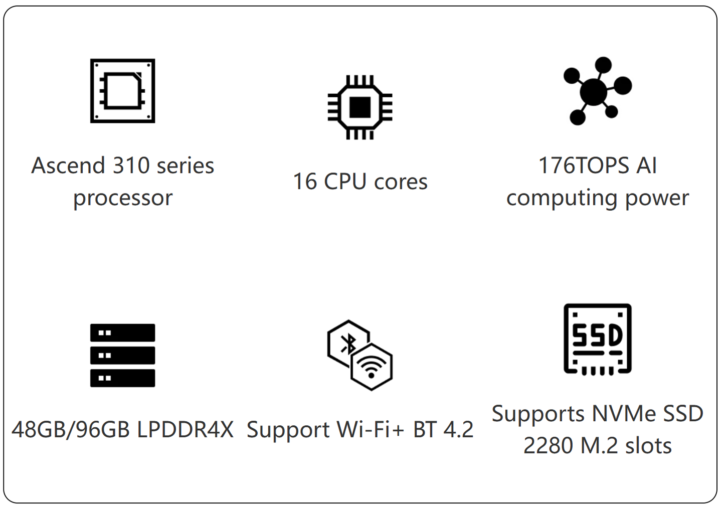 该设备搭载华为昇腾(Ascend)310 处理器,配备 16 核 CPU 及 10 核 NPU,宣称该单板计算机 AI 算力高达 176 TOPS,并提供最高 96GB LPDDR4X 内存。