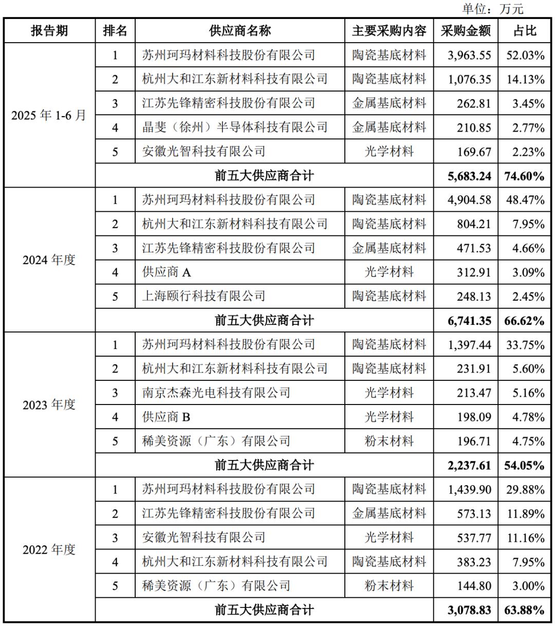 该公司向前五大供应商的采购占比分别为63.88%、54.05%、66.62%、74.60%。其中,超纯股份向珂玛科技采购占比分别为29.88%、33.75%、48.47%、52.03%,2025年上半年采购比例超过50%,存在单一供应商依赖与主要原材料的供应来源较为集中的风险。