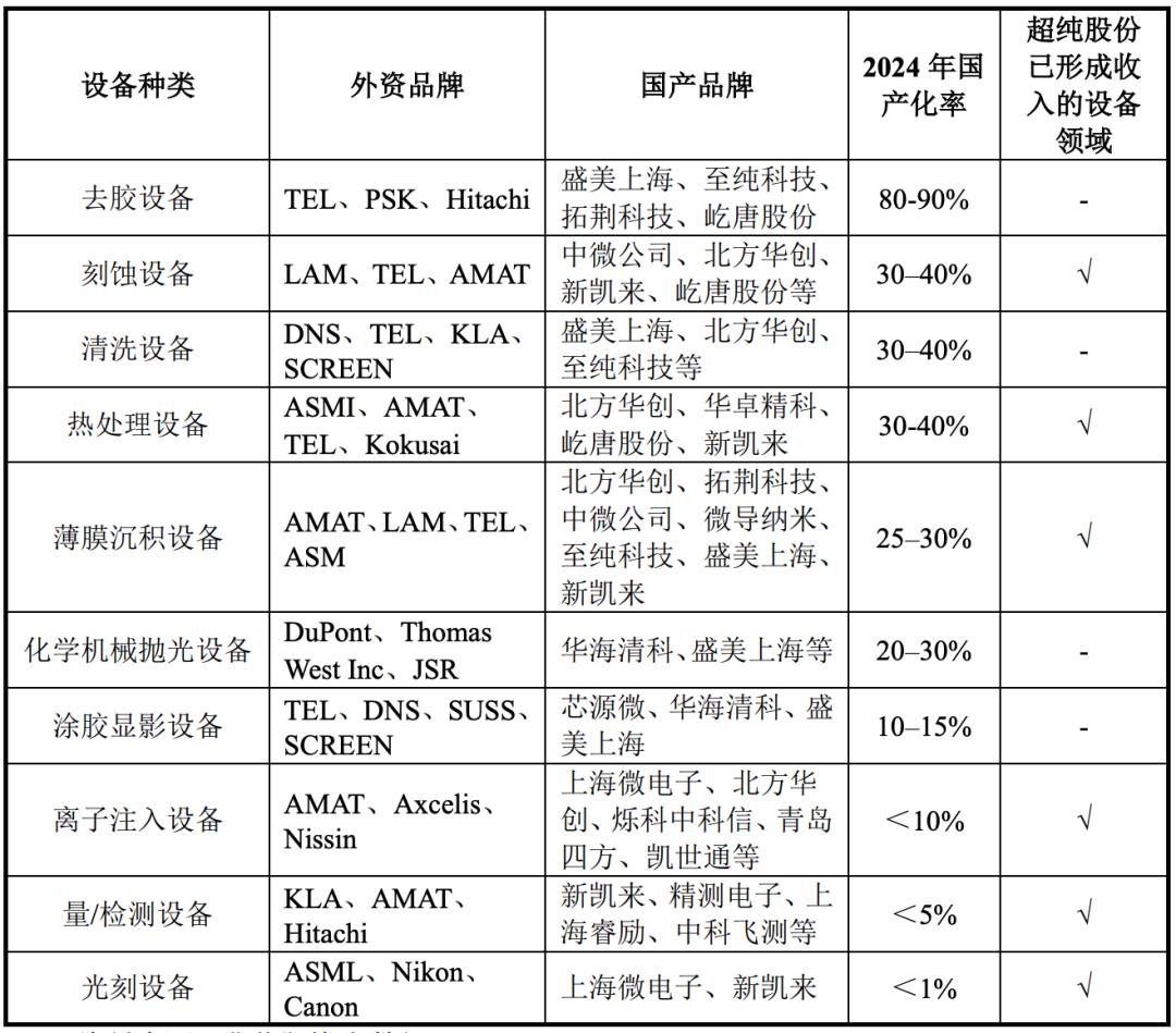 中国大陆有全球最大的半导体消费市场和半导体设备销售市场,但半导体设备国产率较低,根据弗若斯特沙利文数据,超纯股份已经在刻蚀设备、热处理设备、薄膜沉积设备、离子注入设备、量/检测设备、光刻设备中实现收入。