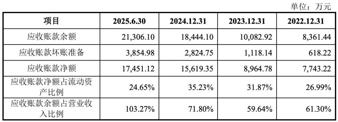 2022年至2025年上半年,该公司应收账款的账面价值分别为0.77亿元、0.90亿元、1.56亿元、1.75亿元,占总资产的比例分别为22.22%、22.50%、20.52%、19.36%。