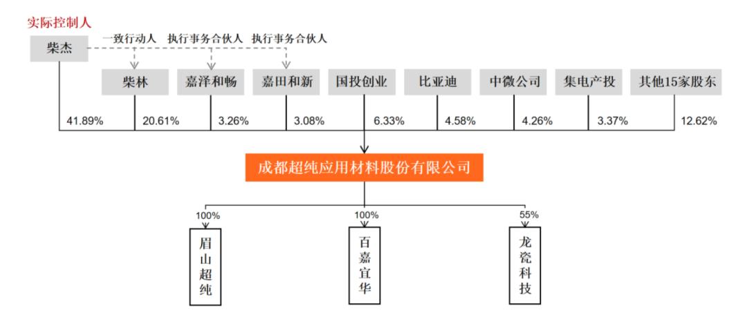 超纯股份的控股股东、实际控制人为董事长、总经理柴杰,柴杰之兄超纯股份董事、总工程师柴林是其一致行动人,柴杰及其一致行动人合计控制超纯股份68.84%的表决权。此外,国投创业持股6.33%,比亚迪持股4.58%,中微公司持股4.26%。