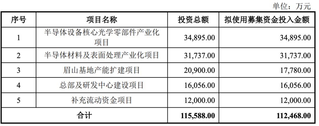 超纯股份拟募资金额为11.25亿元,将用于半导体设备核心光学零部件产业化项目、半导体材料及表面处理产业化项目、眉山基地产能扩建项目、总部及研发中心建设项目、补充流动资金项目。