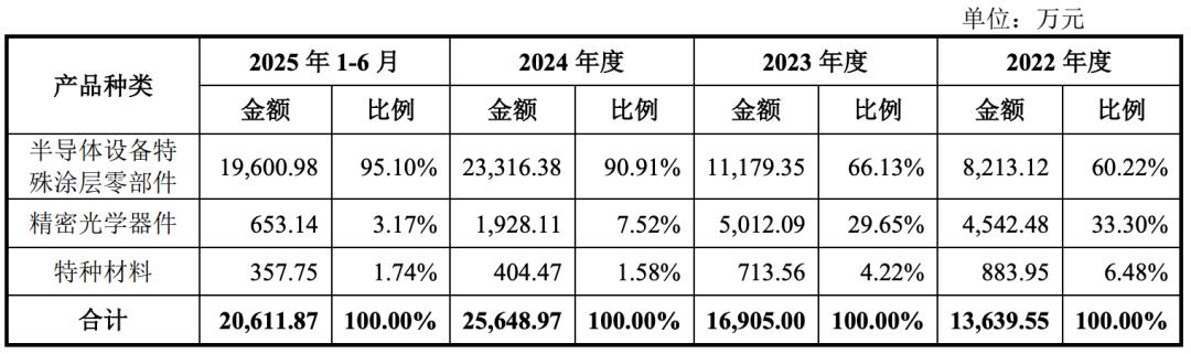 超纯股份的产品主要包括半导体设备特殊涂层零部件、精密光学器件和特种材料,其中半导体设备特殊涂层零部件收入占报告期各期营业收入九成以上。