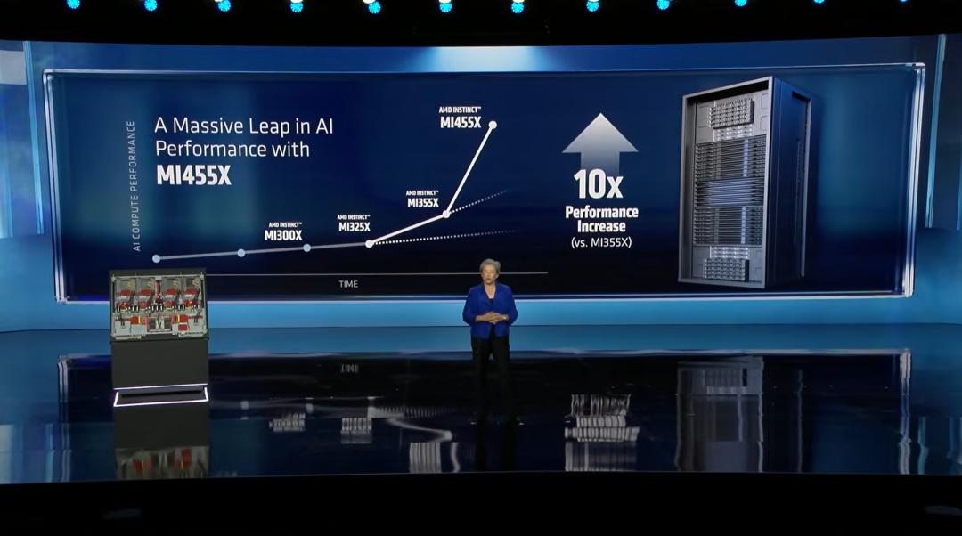 - 10倍性能跃迁:相比于前代MI355X,MI455X实现了10倍的性能提升。