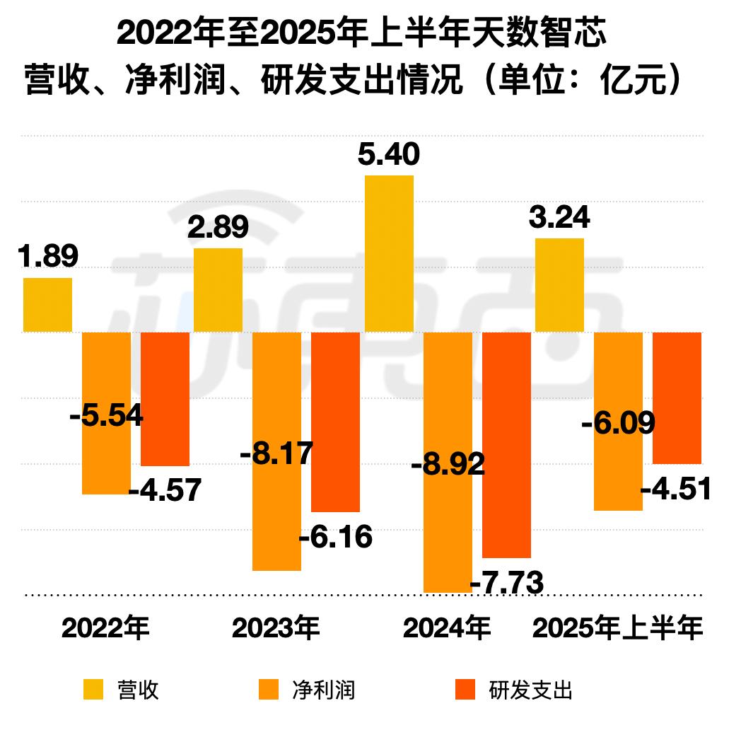 从具体的财务数据来看,2022年至2025年上半年,天数智芯营收分别为1.89亿元、2.89亿元、5.40亿元、3.24亿元,净利润分别为-5.54亿元、-8.17亿元、-8.92亿元、-6.09亿元,研发支出分别为4.57亿元、6.16亿元、7.73亿元、4.51亿元。