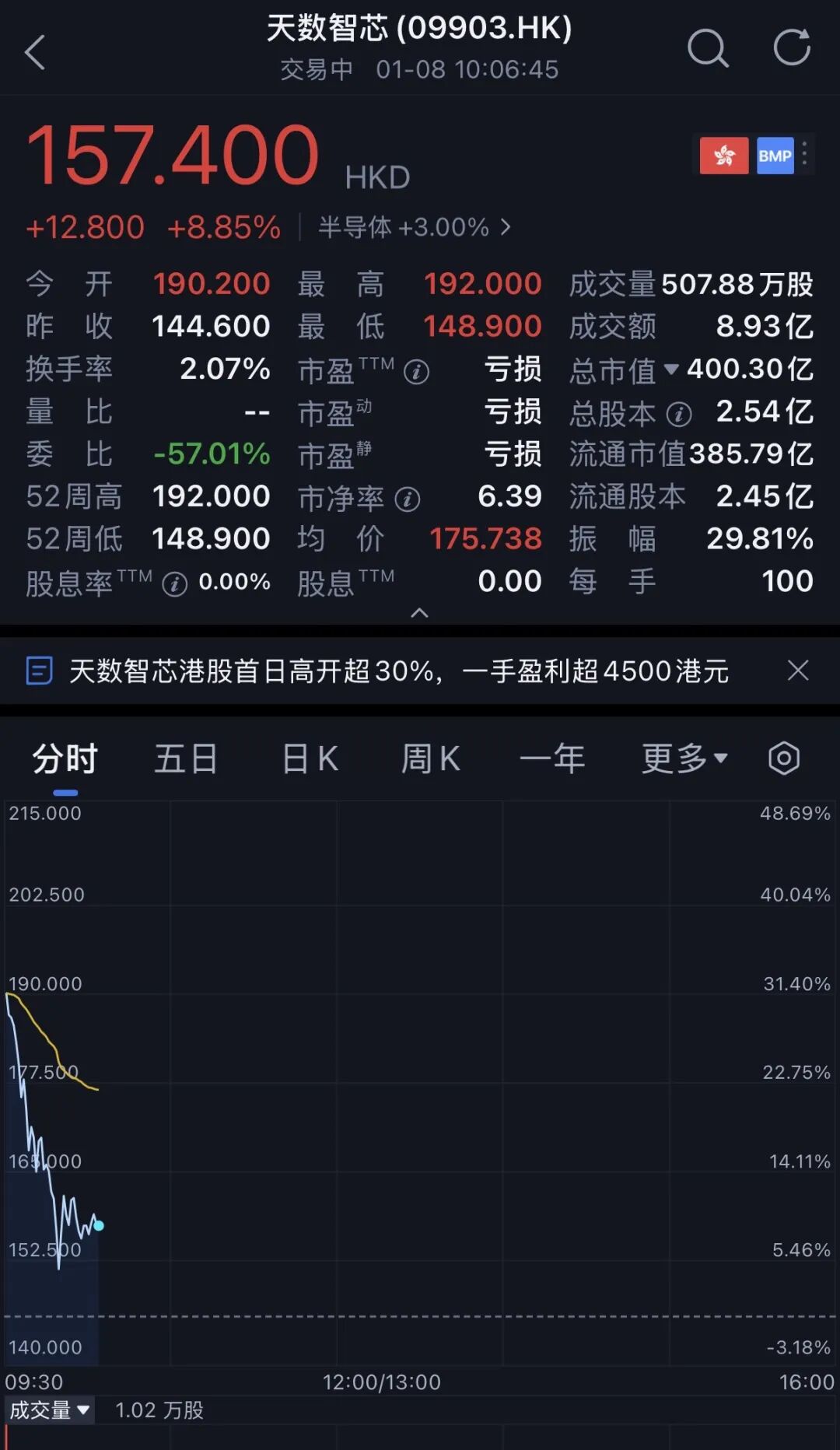 发行价每股144.60港元(约合人民币129.92元),开盘价上涨31.54%至每股199.2港元(约合人民币170.9元),截至10点左右,天数智芯股价为每股157.4港元(约合人民币141.367元),市值为400.30亿港元(约合人民币359.53亿元)。
