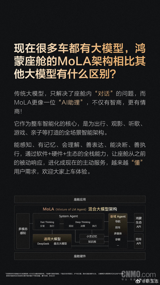 靳玉志还解答了“鸿蒙座舱的MoLA架构相比其他大模型有什么区别”这一问题。他表示,传统大模型,只解决了座舱内“对话”的问题,而MoLA更像一位“AI助理”,不仅有智商,更有情商!它作为整车智能化的核心,是为出行、观影、听歌、游戏、亲子等打造的全场景智能架构。能感知、有记忆、会理解、善表达、能决断、善执行,通过软件+硬件+生态的全栈能力,让座舱从之前的被动响应,进化成现在的主动服务,越来越“懂”用户需求。